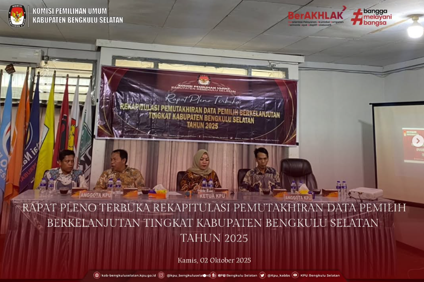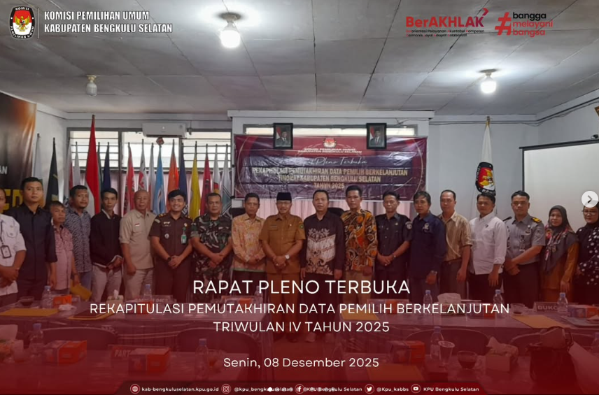 #TemanPemilih, Senin 8 Desember 2025 KPU Kabupaten Bengkulu Selatan melaksanakan Rapat Pleno Terbuka Rekapitulasi Daftar Pemilih Berkelanjutan Triwulan IV Tahun 2025 Tingkat Kabupaten Bengkulu Selatan. Acara ini dihadiri oleh Plt. Ketua dan Anggota KPU Kabupaten Kabupaten Bengkulu Selatan. Acara ini juga mengundang Polres Bengkulu Selatan, Kodim 0408 Bengkulu Selatan,Kejaksaan Negeri Kabupaten Bengkulu Selatan, Bawaslu Kabupaten Bengkulu Selatan, Kesbangpol Bengkulu Selatan, Disdukcapil Kabupaten Bengkulu Selatan , Rutan Kelas IIB Manna dan Perwakilan Partai Politik Se-kabupaten Bengkulu Selatan. Berdasarkan Hasil Pleno Triwulan IV Tahun 2025, KPU Kabupaten Bengkulu Selatan menetapkan 129.187 pemilih sebagai hasil akhir Pemutakhiran Data Pemilih Berkelanjutan di 11 kecamatan yang tersebar 158 Kelurahan/Desa di Kabupaten Bengkulu Selatan. #KPUMelayani ....