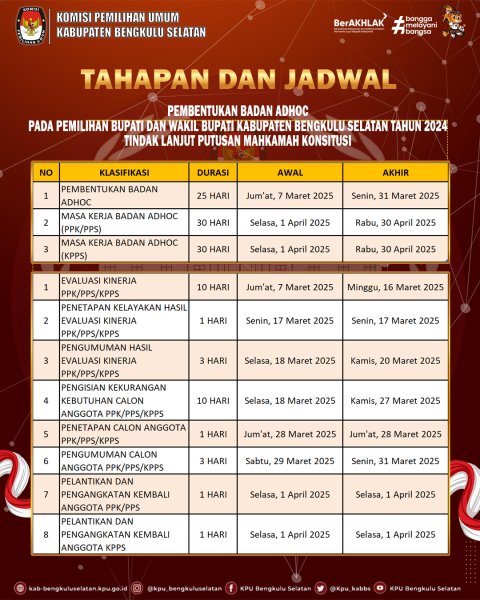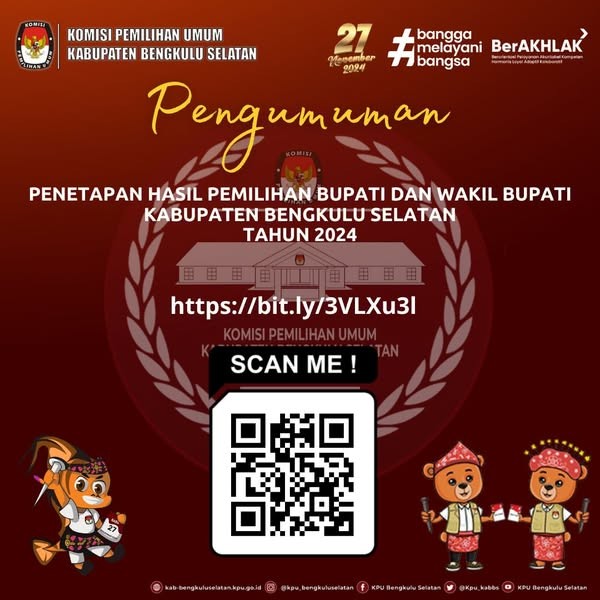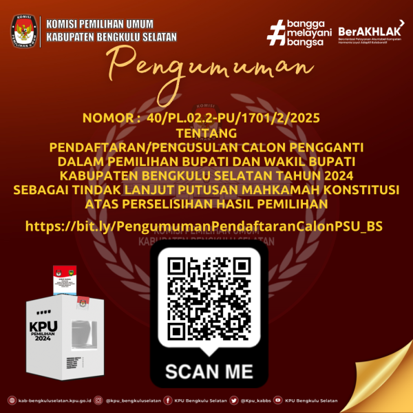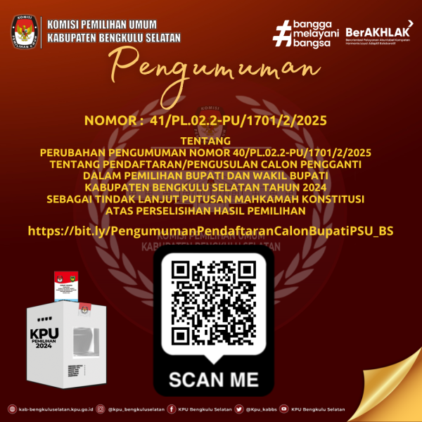 #TemanPemilih, BERIKUT KAMI SAMPAIKAN TENTANG PERUBAHAN PENGUMUMAN NOMOR 40/PL.02.2-PU/1701/2/2025 TENTANG PENDAFTARAN/PENGUSULAN CALON PENGGANTI DALAM PEMILIHAN BUPATI DAN WAKIL BUPATI KABUPATEN BENGKULU SELATAN TAHUN 2024 SEBAGAI TINDAK LANJUT PUTUSAN MAHKAMAH KONSTITUSI ATAS PERSELISIHAN HASIL PEMILIHAN