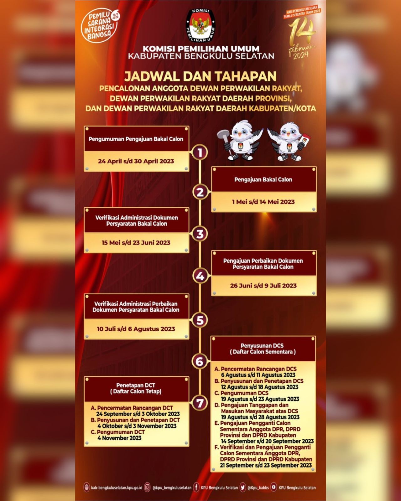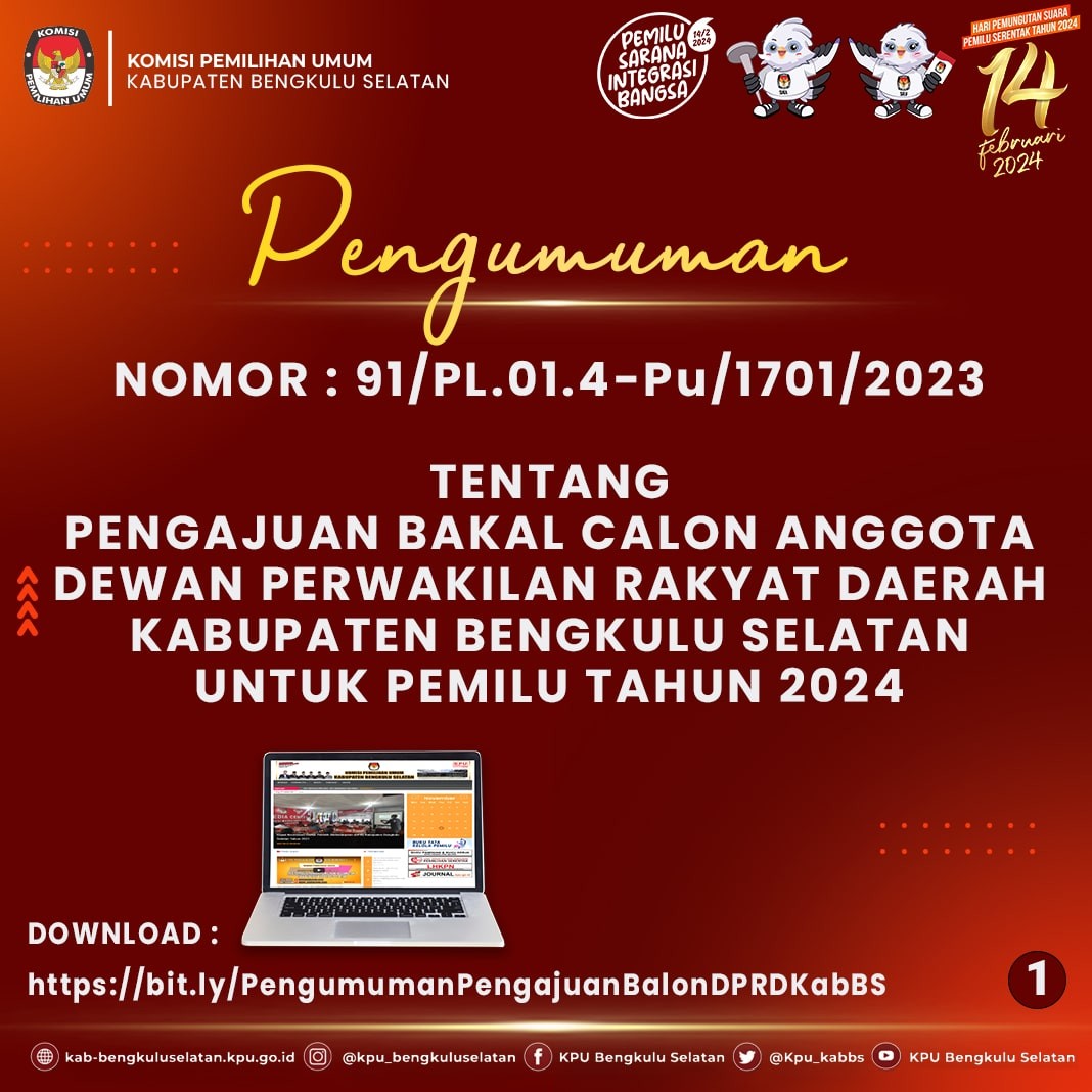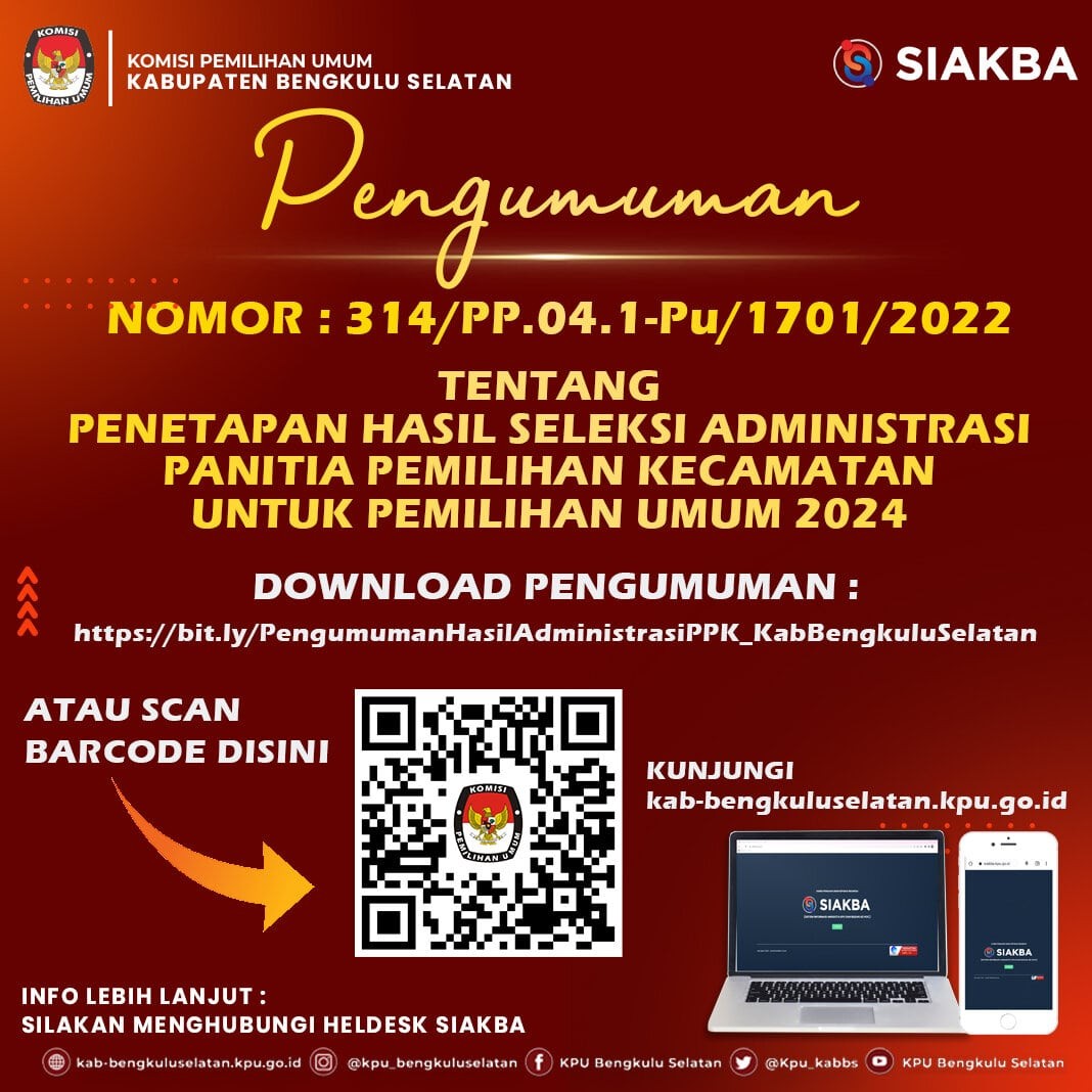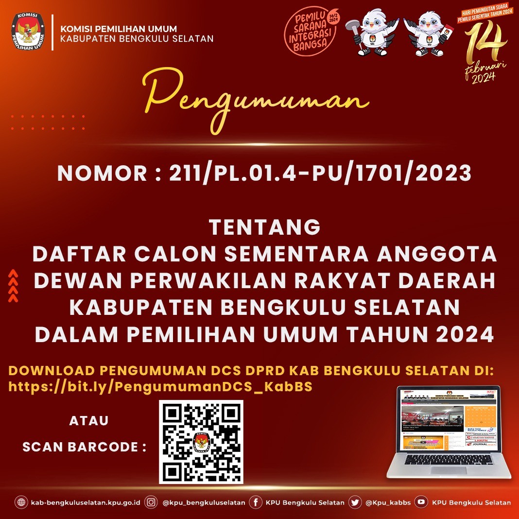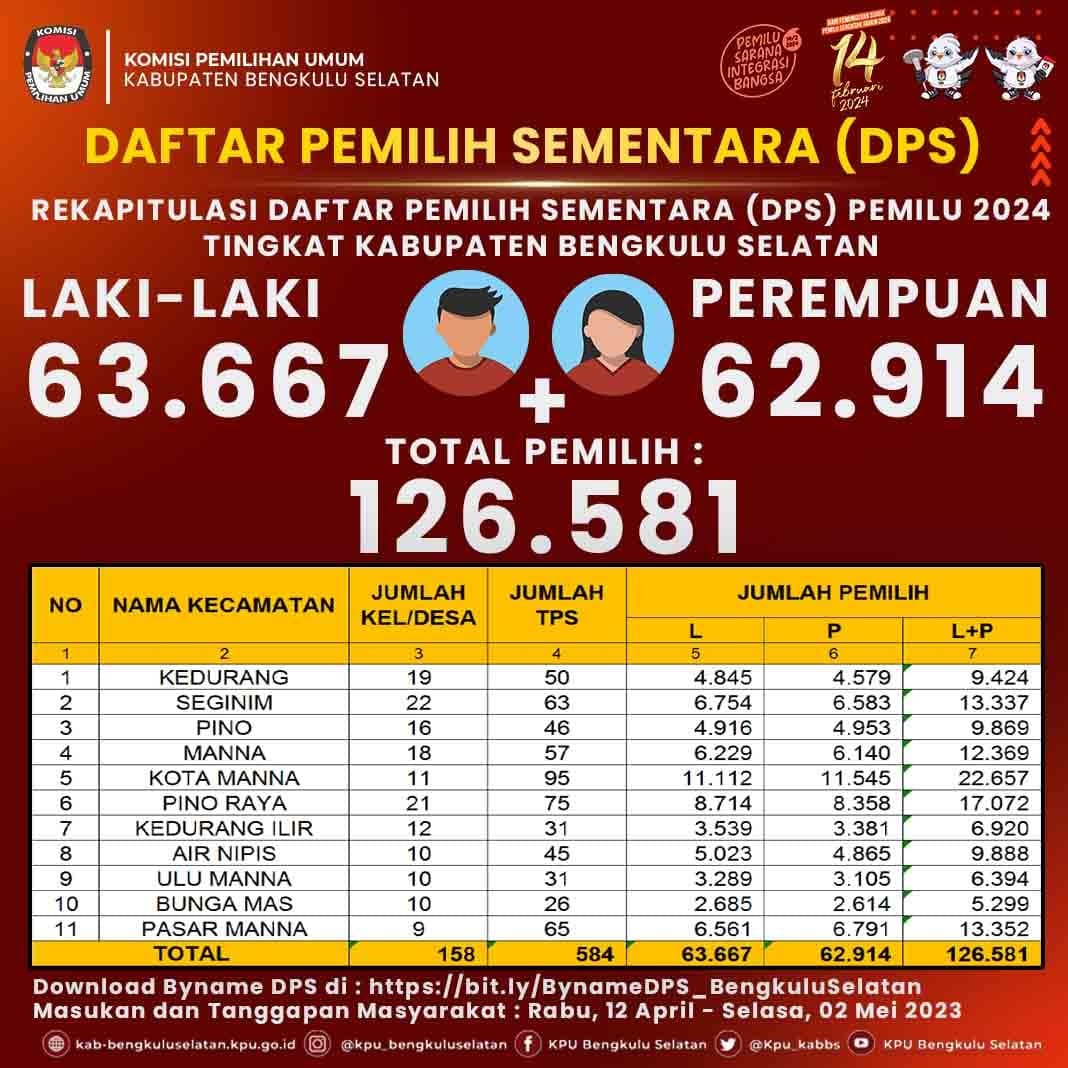 #TemanPemilih KPU Kabupaten Bengkulu Selatan mengumumkan Daftar Pemilih Sementara (DPS) pada 11 Kecamatan dan 158 Desa/Kelurahan dengan Jumlah Pemilih Laki-laki 63.667 dan Perempuan 62.914 dengan Total Pemilih 126.581 Pemilih.